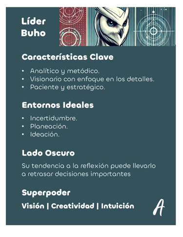 En el contexto del liderazgo, el búho representa la capacidad de reflexión y estrategia que todo líder necesita en situaciones complejas. Este perfil de liderazgo no solo prioriza el análisis detallado y la comprensión integral de los problemas, sino que también inspira confianza al actuar con calma y determinación. Al igual que el búho, el líder reflexivo sabe observar con detenimiento, procesar información desde todos los ángulos y tomar decisiones que consideren tanto las necesidades inmediatas como las implicaciones a largo plazo. Su fortaleza radica en la intuición cultivada a través de la experiencia y el conocimiento profundo, permitiéndole detectar oportunidades y amenazas antes que otros.