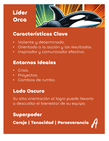 En el liderazgo, la orca simboliza la valentía y la determinación necesarias para guiar a un equipo hacia objetivos ambiciosos. Este perfil de líder no sólo inspira confianza a quienes lo rodean, sino que también los impulsa a la acción con su ejemplo. Es un líder que sabe cómo tomar decisiones rápidas y estratégicas, enfrentarse a desafíos sin titubear y movilizar a su equipo para alcanzar metas comunes. La fuerza de este liderazgo radica en su habilidad para equilibrar la autonomía con la colaboración, asegurando que todos trabajen hacia un propósito compartido con claridad y convicción.