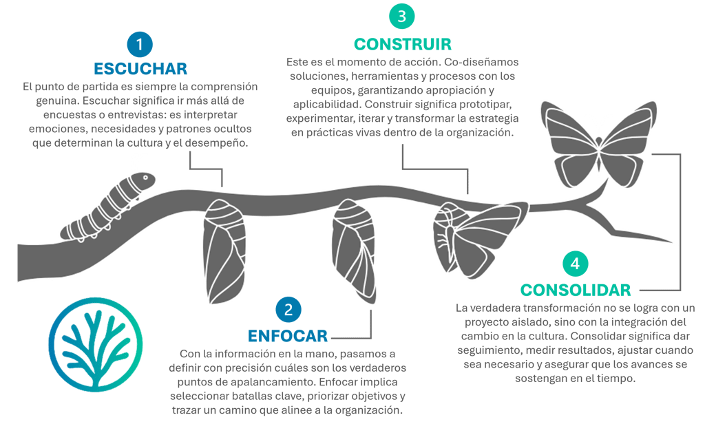 Diseñamos e implementamos soluciones de consultoría a la medida que combinan rigor analítico, visión estratégica y acompañamiento cercano para impulsar la evolución cultural y competitividad de las organizaciones. Partimos de un diagnóstico ágil y profundo que nos permite identificar con precisión las palancas de cambio y construir intervenciones efectivas que generan resultados tangibles en el corto plazo y transformaciones sostenibles en el largo.